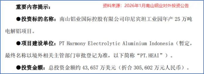 1月19日,南山铝业发布公告称,公司拟通过控股子公司南山铝业国际,在印尼设立年产25万吨电解铝项目,投资金额约30.56亿元。