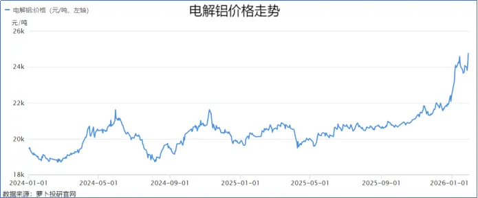 2024年1月,我国电解铝价格在19000元/吨左右徘徊,2026年1月末,这一价格已突破25000元/吨。
