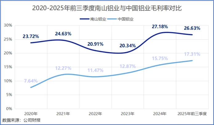 以2025年前三季度为例,全球最大的电解铝生产企业中国铝业的毛利率为17.31%;而南山铝业的毛利率高达26.63%,高出前者近10个百分点。