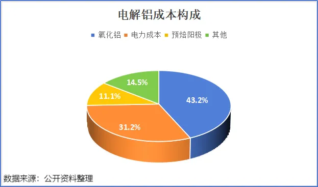 铝的冶炼过程被称为“凝固的电力”,在电解铝的成本结构中,电力成本占比高达31.2%,仅次于原材料氧化铝。