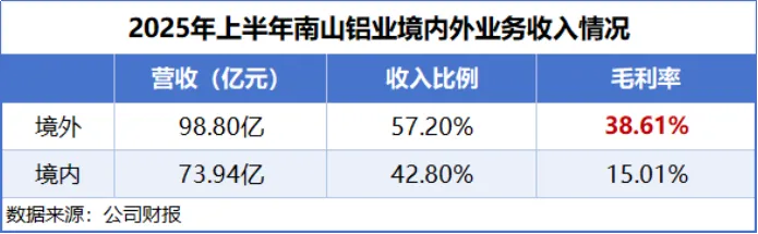2025年上半年,南山铝业境外业务收入为98.8亿元,营收占比超过一半,且这部分业务毛利率高达38.61%,明显高于国内的15.01%。