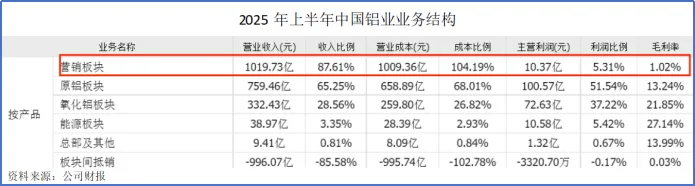 2025年上半年,中国铝业有87.61%的收入都来自营销板块。