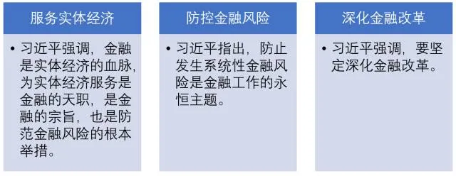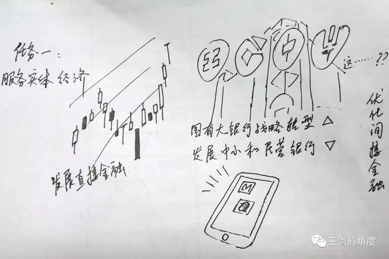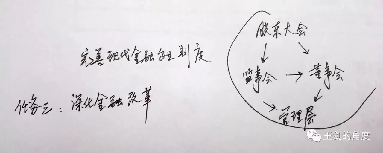 (1)任务一,服务实体经济:发展直接金融,优化间接金融,国有大行战略转型,发展中小和民营金融等。