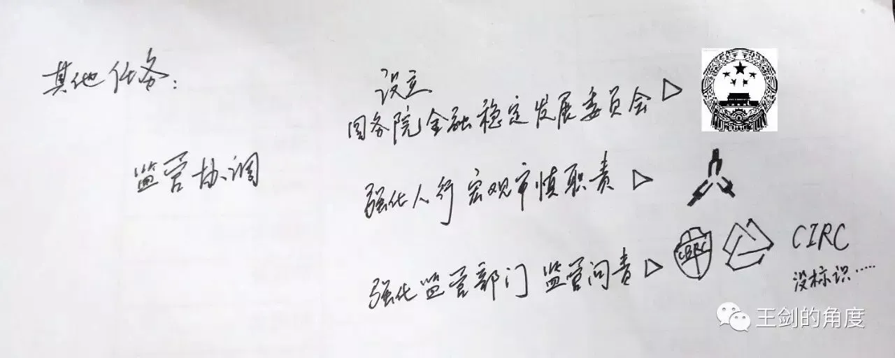 (4)其他任务:监管协调(设立国务院金融稳定发展委员会,强化人行职责,强化监管问责)、金融开放(人民币国际化、资本项目兑换)、加强党的领导等。