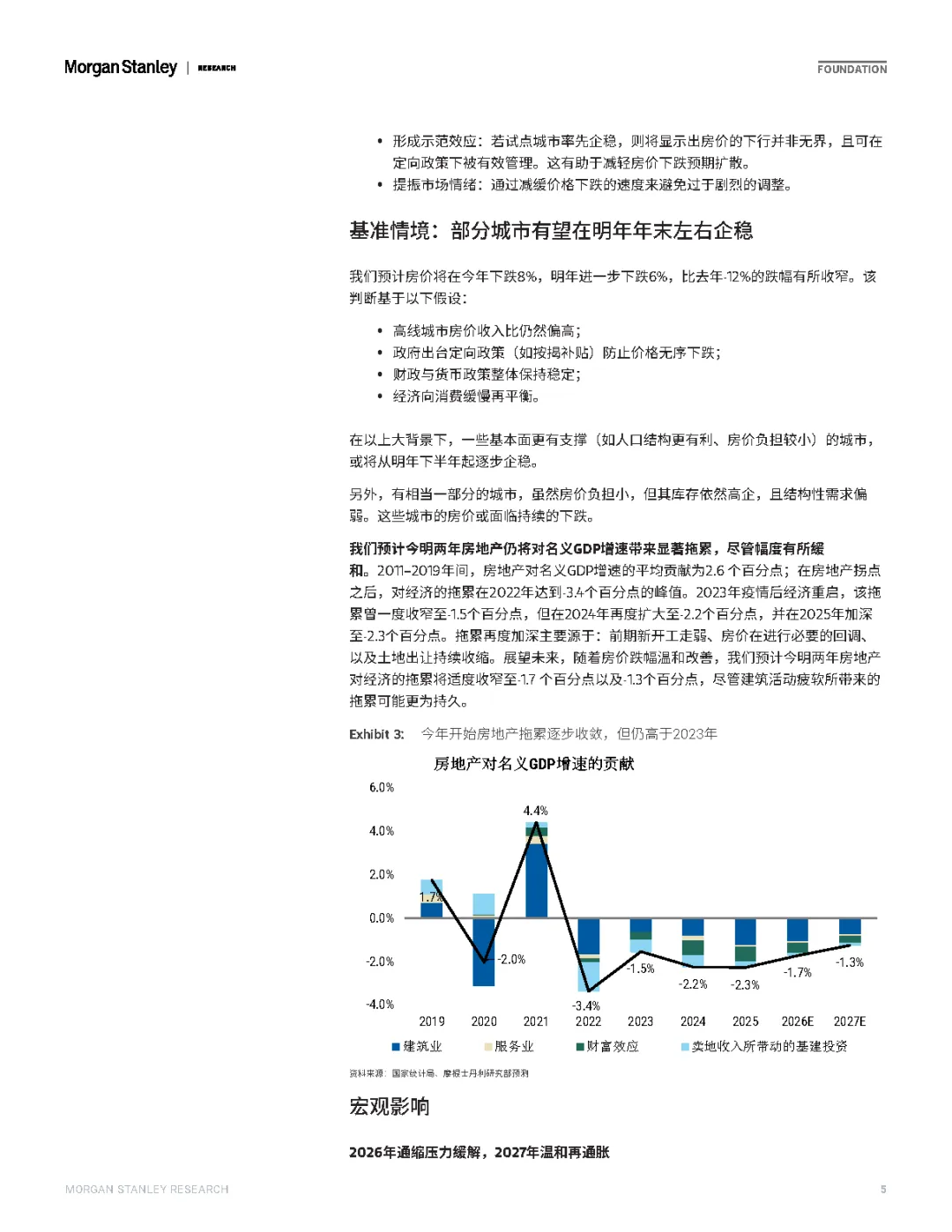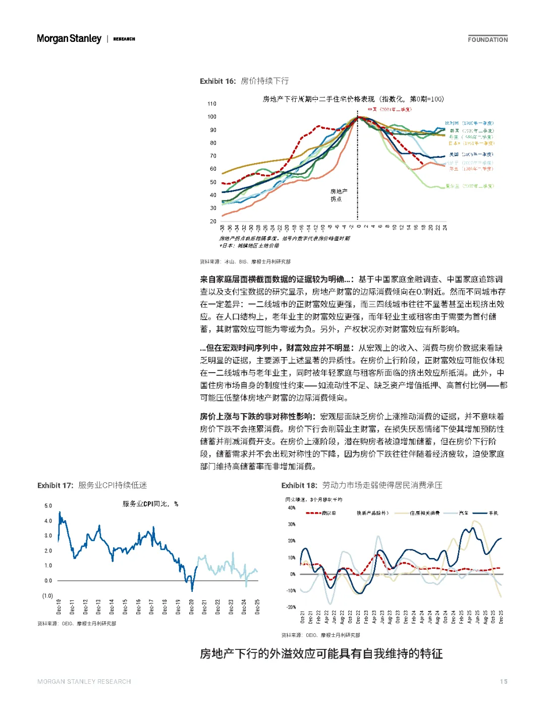 观点也比较直接明确:房地产的慢着陆未来两年或步入尾声。预计政策取向依然是小幅尝试防超调,而非大力刺激强逆转。房价或进一步调整15%,明年下半年初步企稳。这一过程中,房地产对经济的拖累虽然收敛,但仍显著制约着消费和通缩。