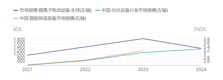 新能源装备市场规模持续扩大,市场前景广阔。2022年,中国风电装机容量达到36544万千瓦,同比增长11.2%,显示出新能源装备市场的强劲增长势头[58]。2023年,随着风电产业回暖,需求持续向好,招标量增长明显[58]。在市场规模方面,2022年全球新能源智能装备市场占全球智能装备市场的15%,其中锂电池智能装备市场规模预计从2024年的498亿元增至2029年的1372亿元,复合年增长率为22.5%[59]。政策支持和市场需求的双重驱动下,新能源装备行业市场规模预计将持续扩大,未来增长前景广阔。