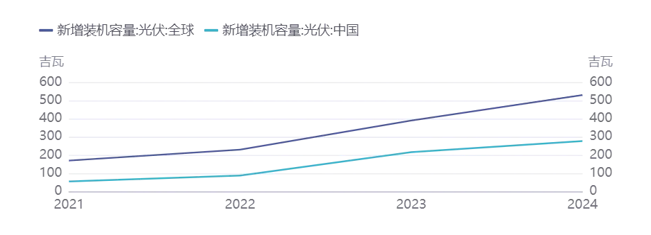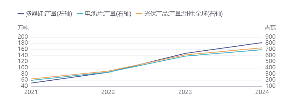 PERC技术主导,N型电池技术加速崛起。2025年光伏组件技术路线演进背景下,PERC(钝化发射极和背面电池)技术占据主导地位[84]。N型电池(如TOPCon、HJT)和钙钛矿电池等新兴技术正逐步崛起,预计到2025年,叠层技术将成为效率突破的新方向[84]。光伏组件核心技术中,PERC技术凭借成熟工艺和高性价比仍保持市场主导地位,但N型电池凭借更高的转换效率和更低的衰减率,正逐步获得市场认可[84]。2024年1至10月,多晶硅产量约158万吨,硅片产量约608GW[83]。国内市场应用方面,2020年至2023年,国内光伏装机量逐年增长,2023年新增装机为216.3GW[83]。海外市场中,硅片、电池片、组件出口整体持续“价减量增”的态势[83]。