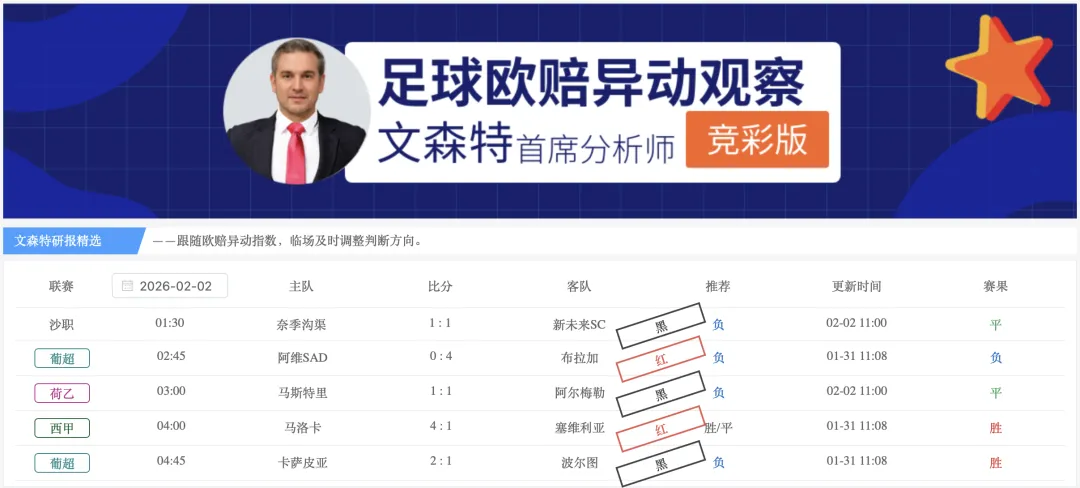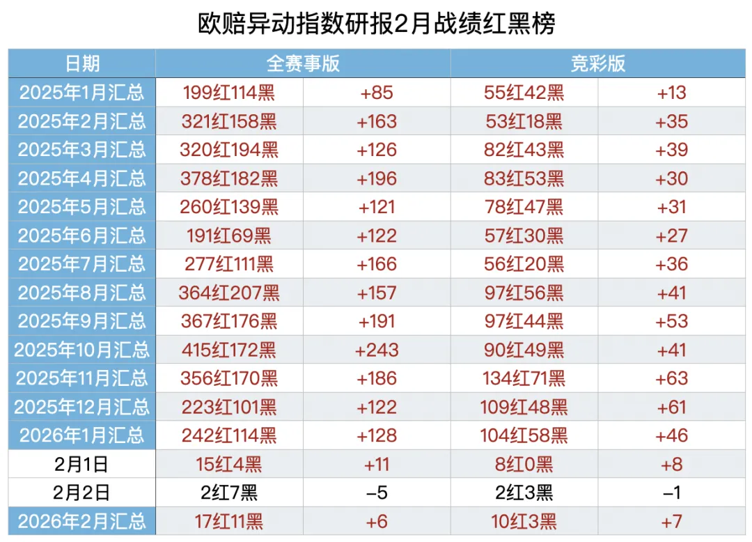 【欧指异动指数】(全赛事版)栏目的研报昨天给出9场比赛,2红7黑,2月累计17红11黑,净胜+6,观察20家主力公司的临场指数变化,掌控比赛方向,2月稳定性到60.7%。