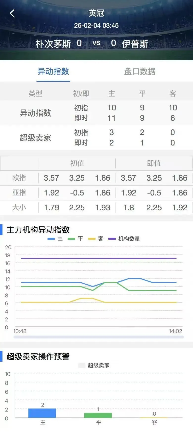 异动指数初指:10-9-10,发生平异动,临场:11-9-6,异动指数越小越容易打出,临场上调主,下调客,机构对于伊普斯维奇赢球给于数据支持。
