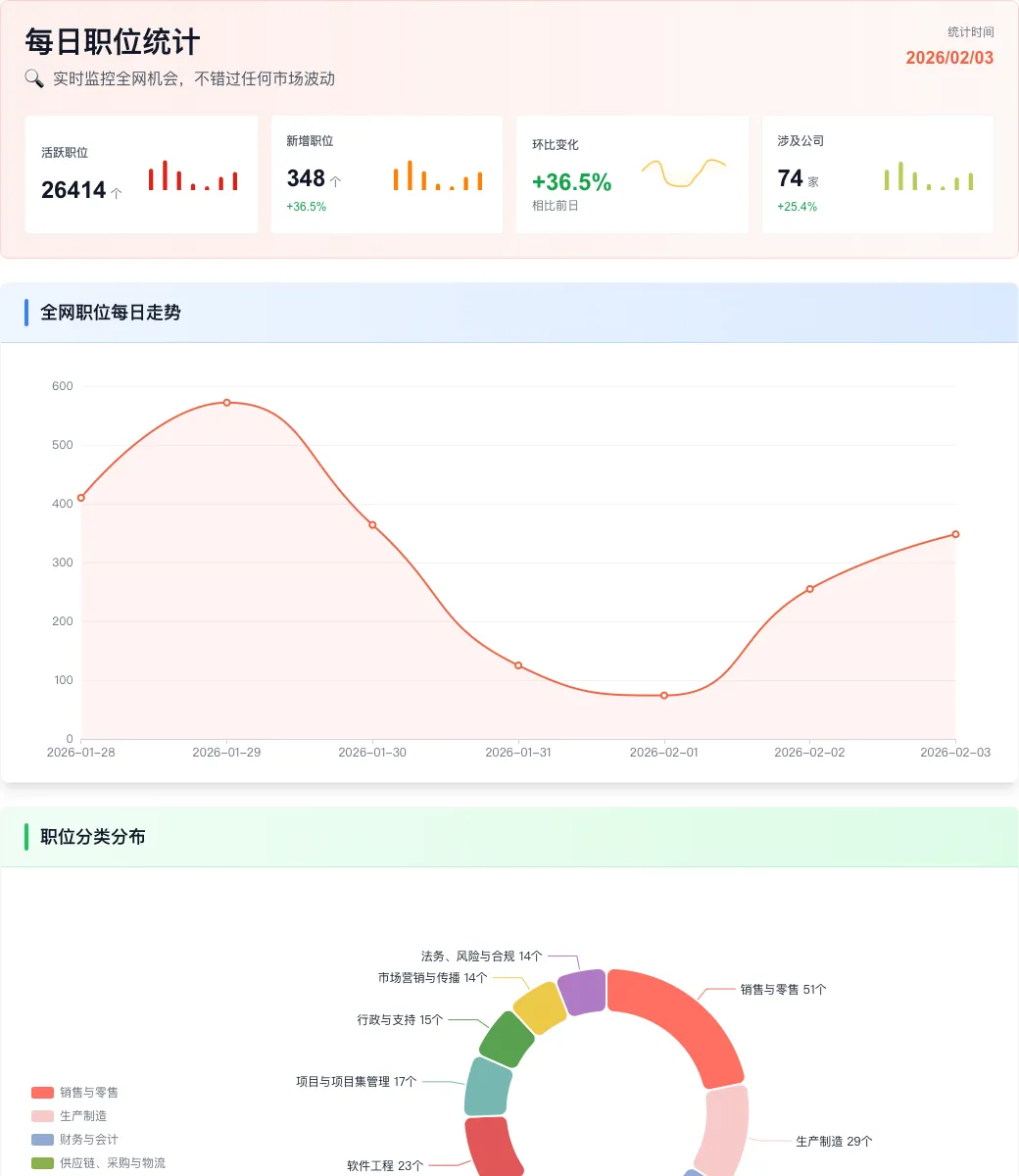 根据最新统计数据显示,截至2026年2月3日,全网活跃职位总数已达 26,414 个。