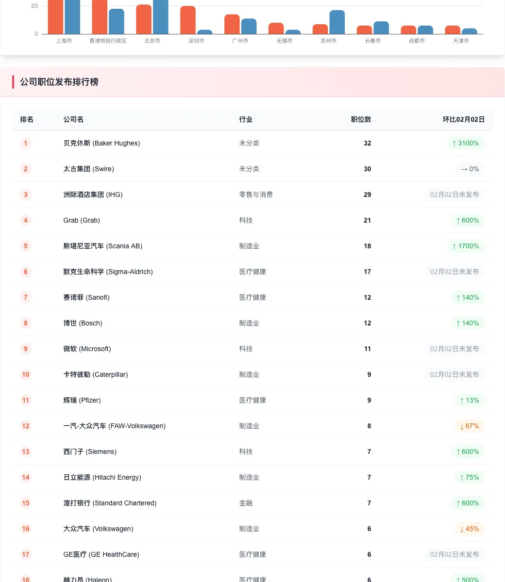 导语: 2026年2月初,全网外企及名企招聘市场呈现出强劲的复苏信号。随着春节后企业预算的释放,新增职位数量在今日迎来爆发。上海作为外企总部高地的地位依旧稳固,而以贝克休斯、洲际酒店、太古集团为代表的传统巨头正开启新一轮的人才扩张。