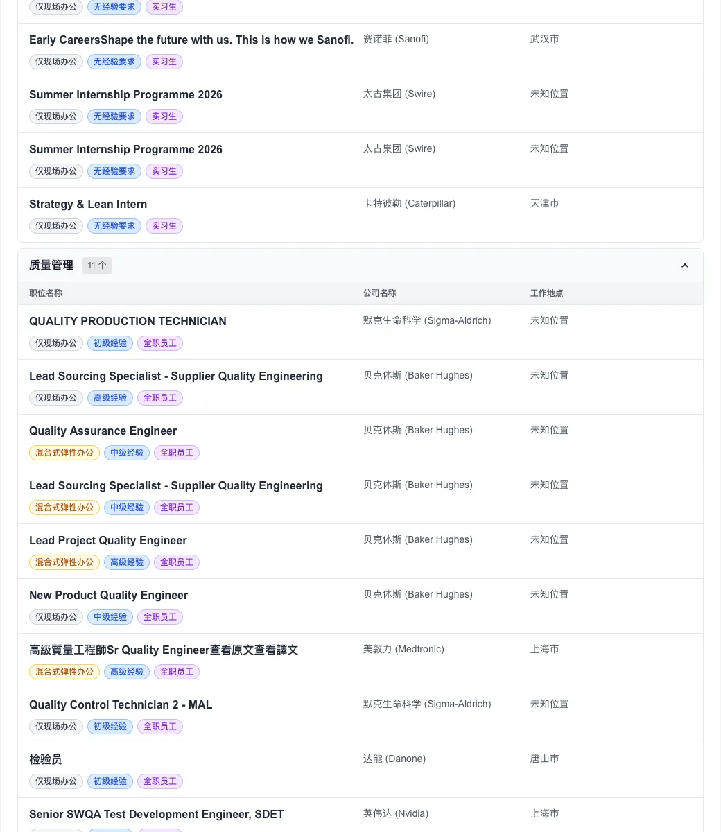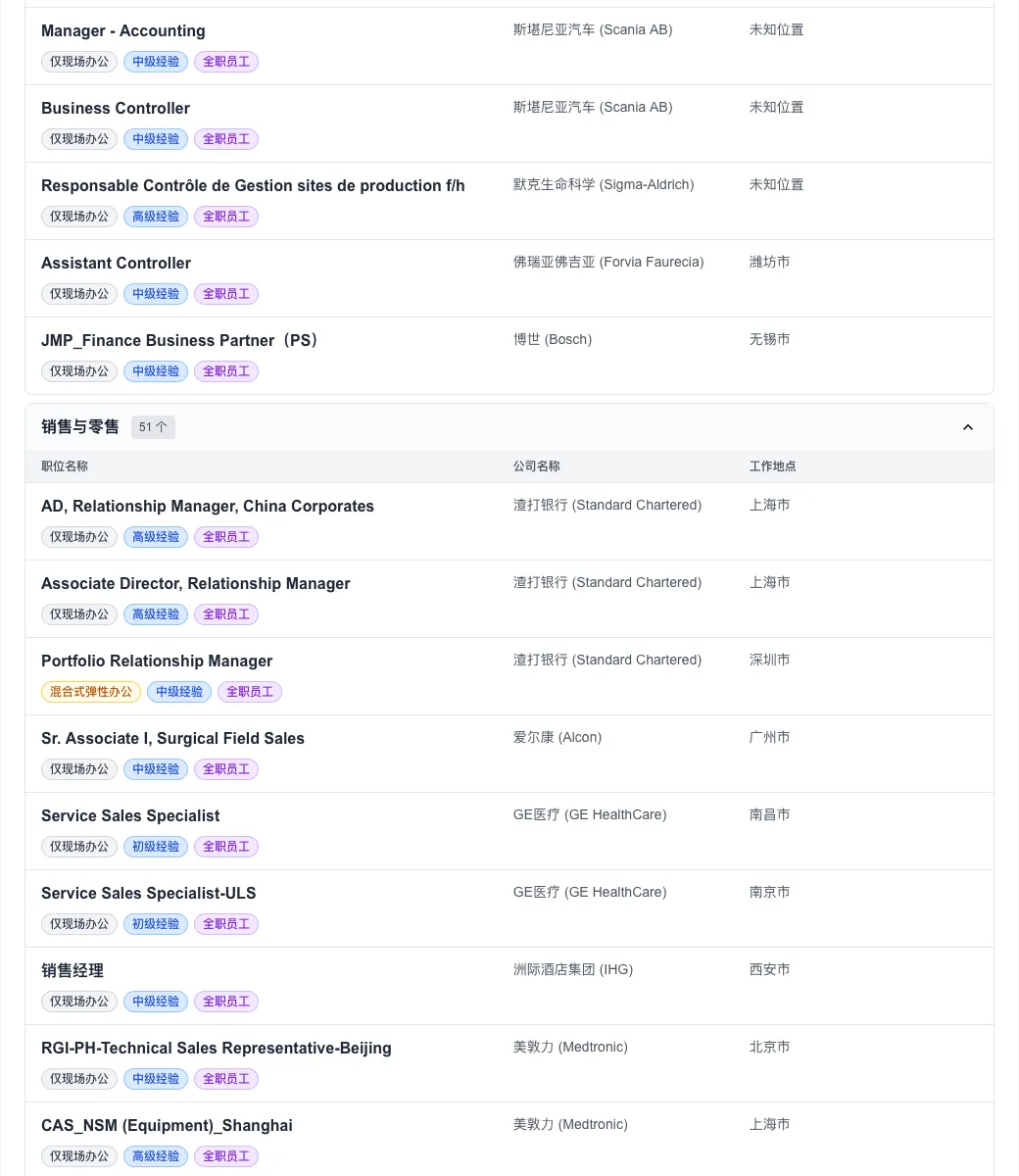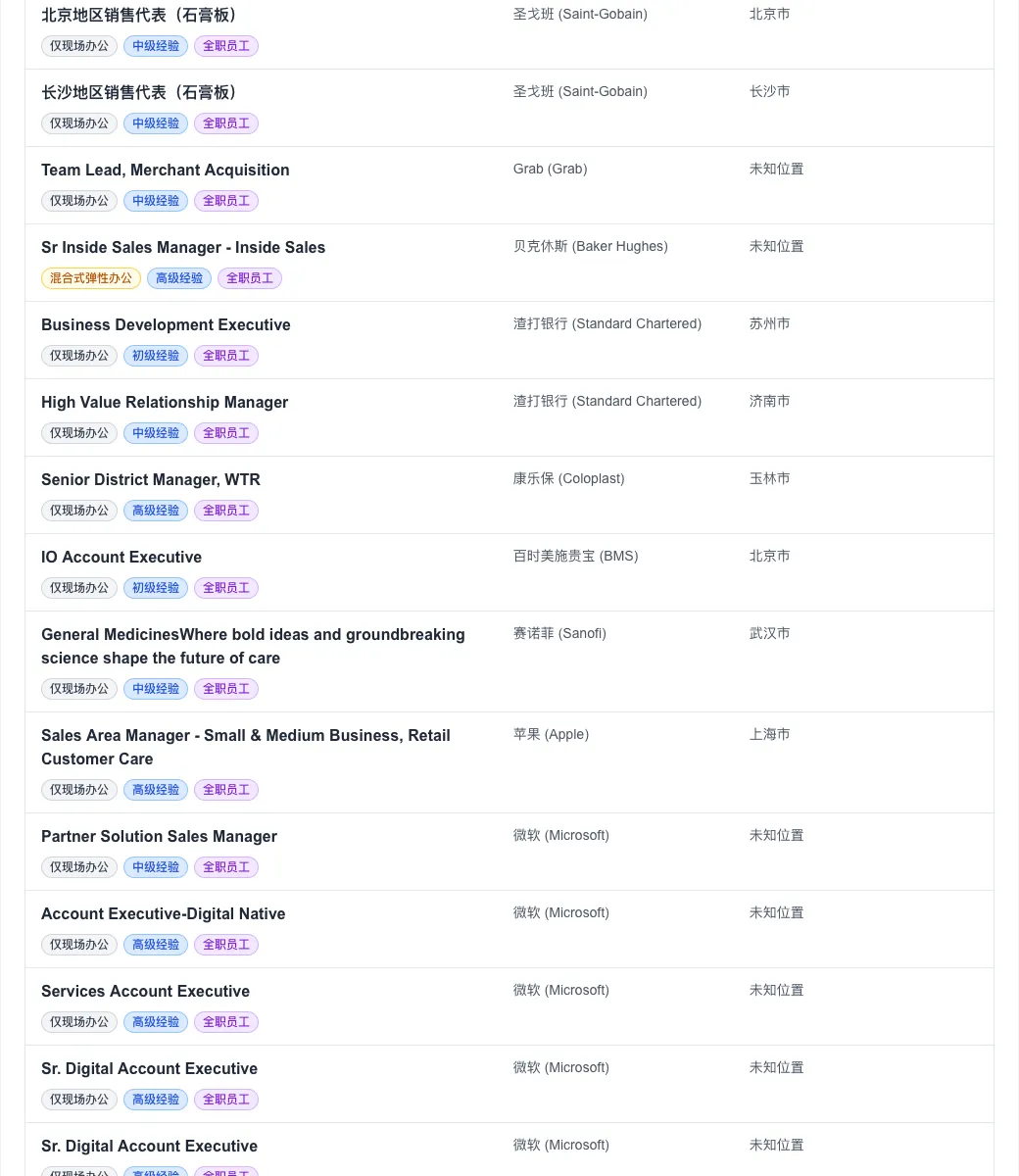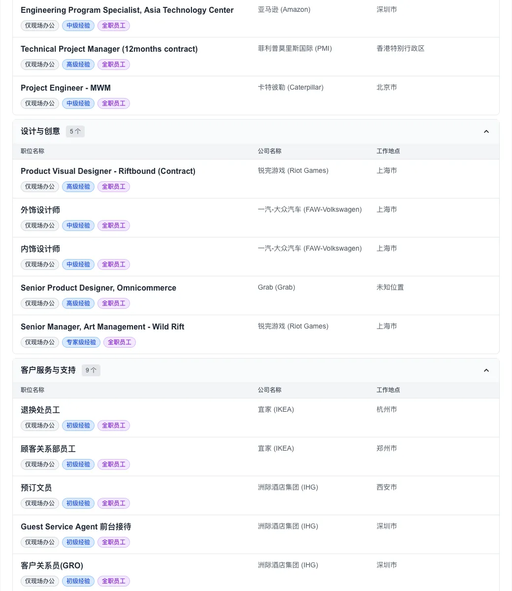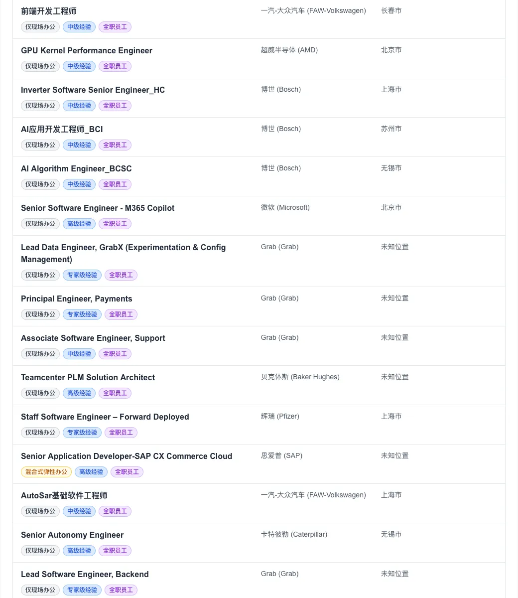 值得关注的是,尽管全球远程办公曾一度盛行,但今日数据显示,“仅现场办公”职位高达 322 个,占比超过九成。这预示着头部外企在管理策略上正加速向“线下回归”。