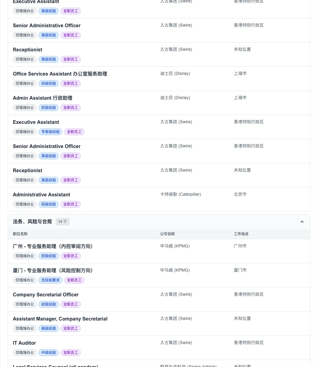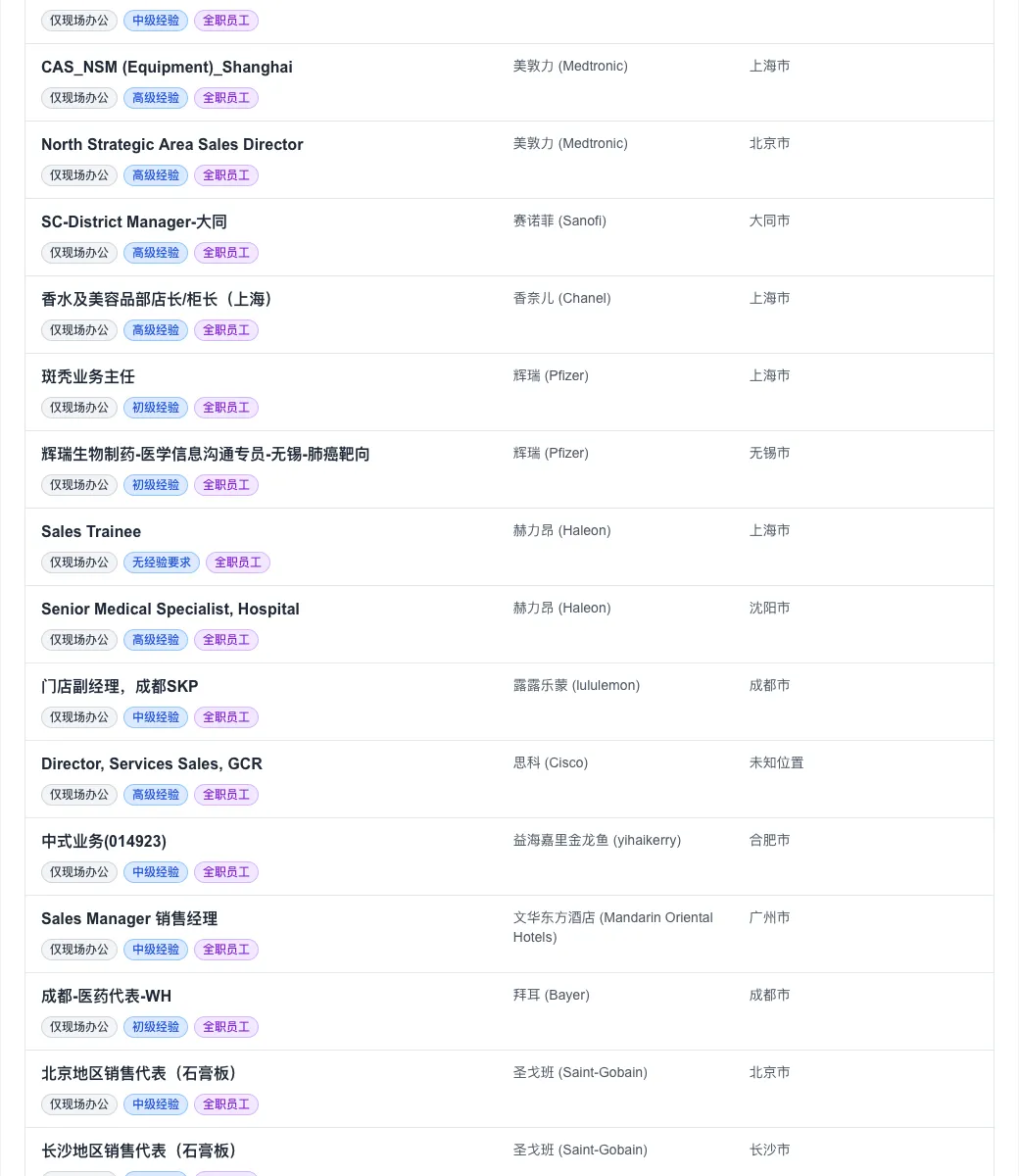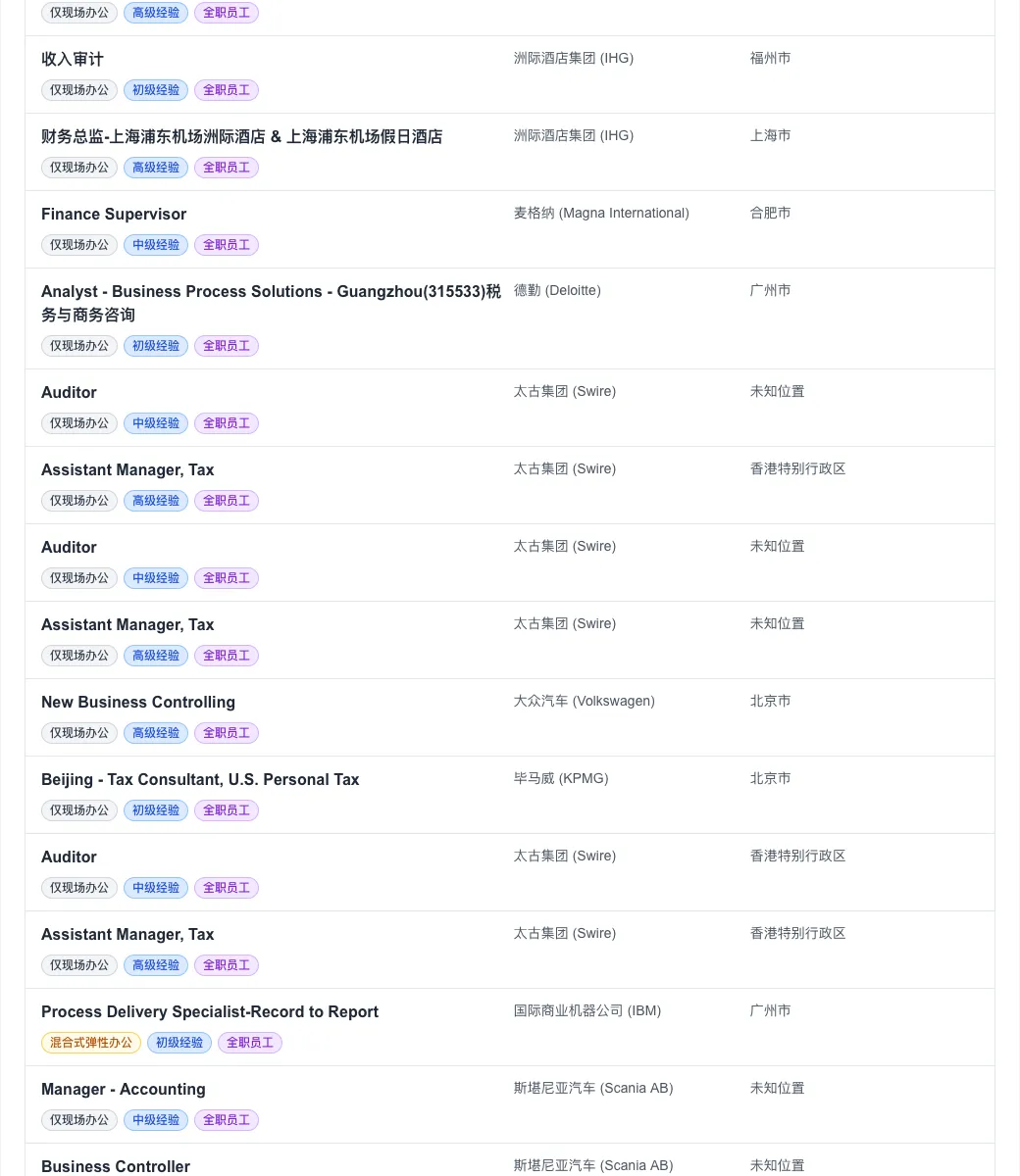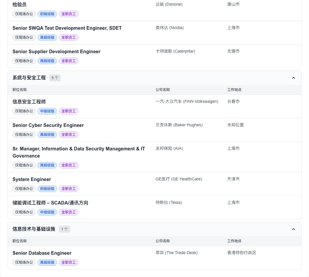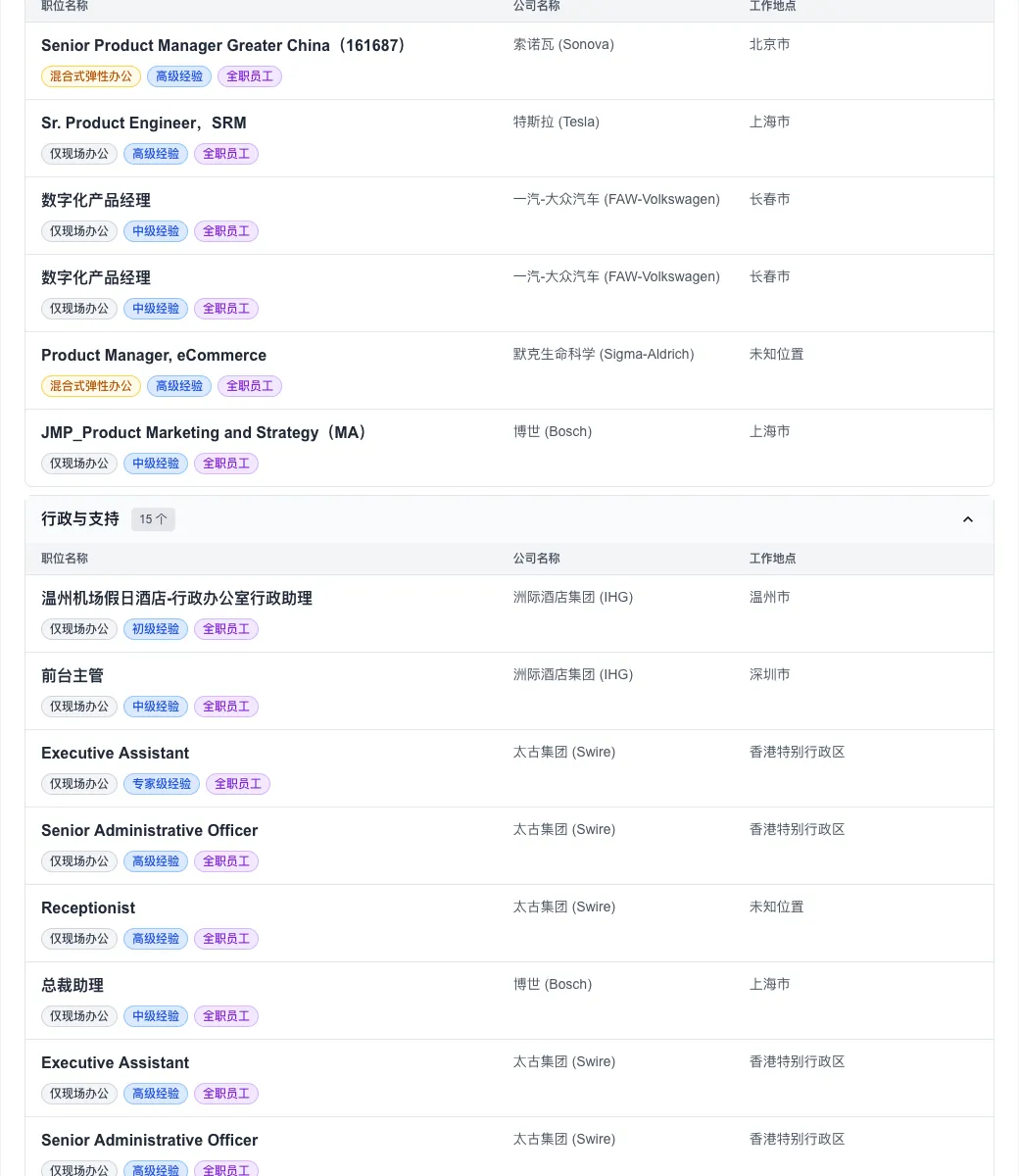 值得关注的是,尽管全球远程办公曾一度盛行,但今日数据显示,“仅现场办公”职位高达 322 个,占比超过九成。这预示着头部外企在管理策略上正加速向“线下回归”。