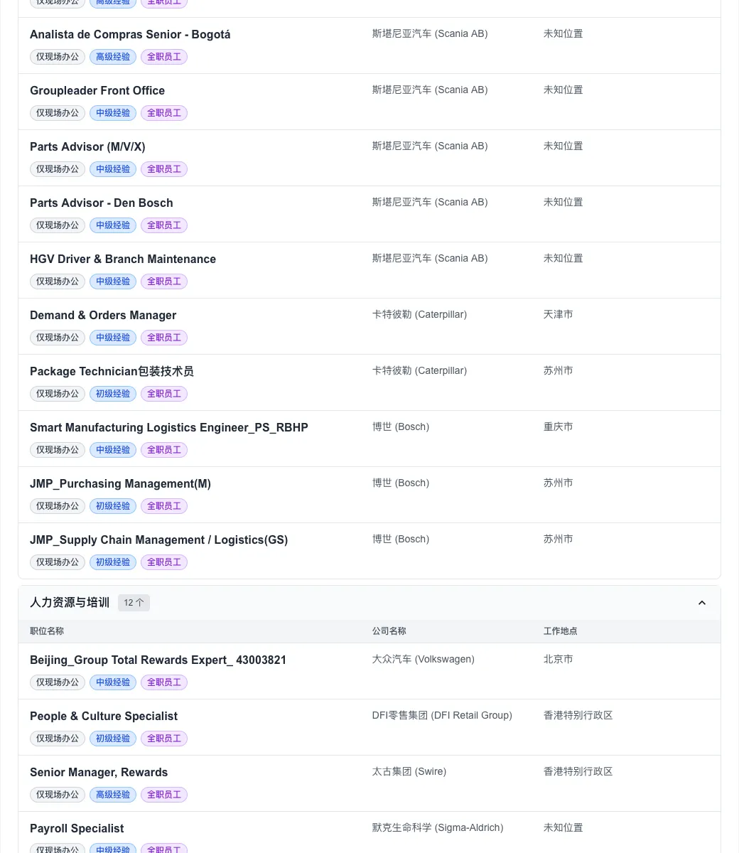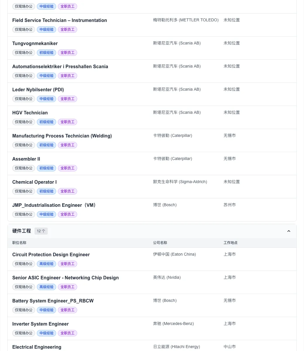 斯堪尼亚(Scania AB)、卡特彼勒(Caterpillar) 等传统制造名企也在今日释出了大量技术与管理岗位,市场活跃度处于高位。