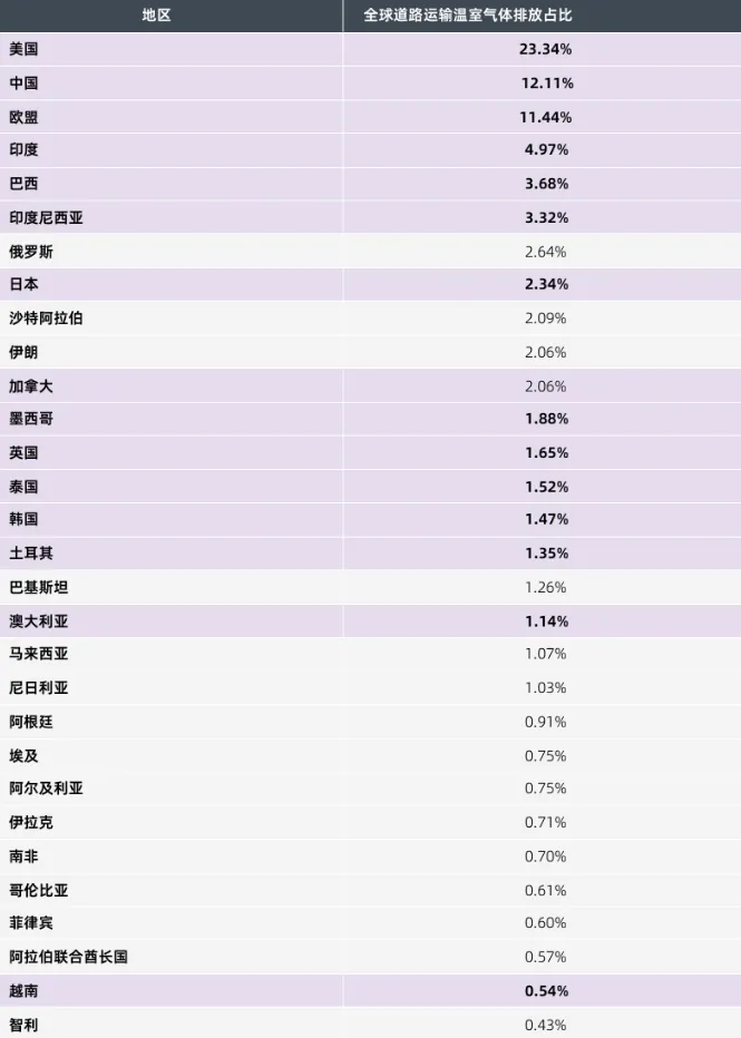2024 年,全球道路交通温室气体排放的 90% 来自排名前 30 的市场,而乘用车不仅贡献了全球道路交通一半以上的排放,其电动汽车销量也占全球电动汽车总销量的 60% 以上,所以这些既是主要排放来源、又是轻型乘用电动汽车核心市场的区域,格外值得关注。