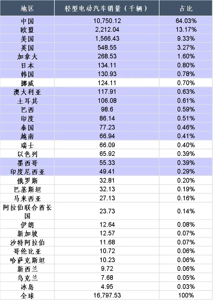 在澳大利亚、巴西、印尼、墨西哥和泰国这几个电动汽车增长最快的国家,中国电动汽车的销量占比都超过了一半。