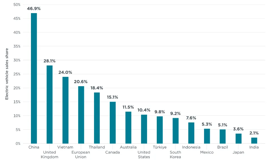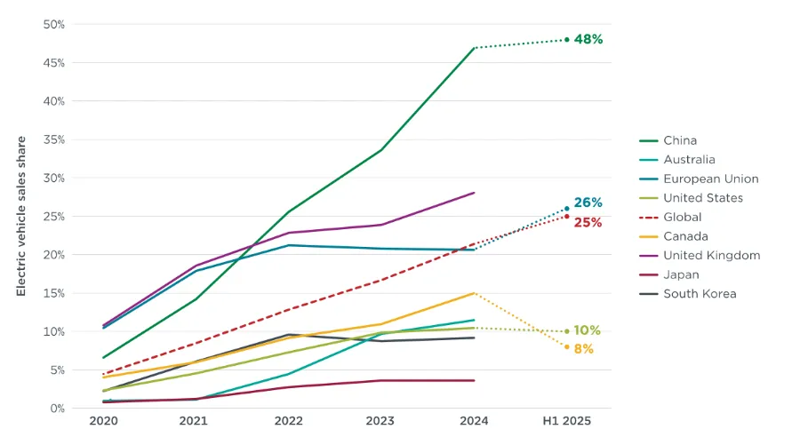 中国一直领跑全球,这一比例从 2020 年的 6.6% 增至 2024 年的 47%,2025 年有望逼近 50%,这离不开产业政策、财政支持和环保相关规则的共同推动。