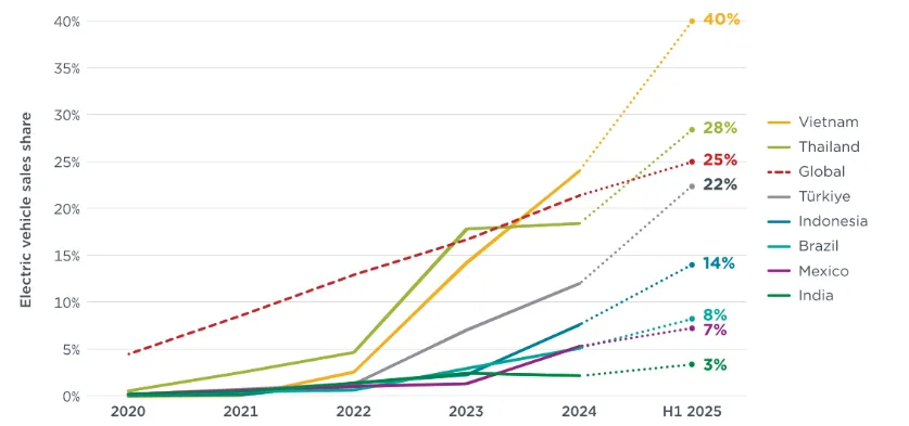 越南靠着本土车企 VinFast 的快速发展,该比例从 2020 年几乎为零飙升至 2025 年上半年的 40%;