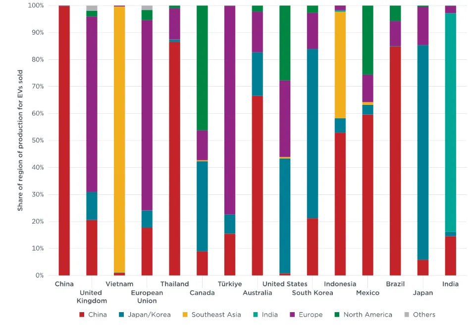 全球销售的轻型乘用电动汽车中,超过四分之三产自中国、欧洲(主要是欧盟)、日本、韩国和北美(主要是美国),除了这些主要制造中心,越南、印度等东南亚国家的电动汽车需求,很大程度上也靠本土生产来满足。
