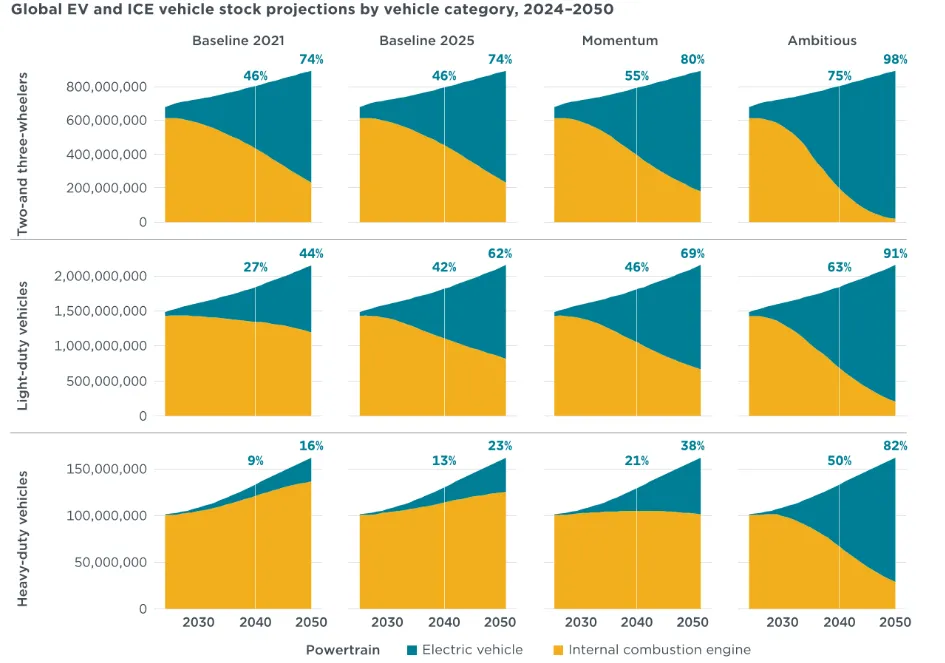 从相关数据来看,两轮和三轮车的电动化差距最小,按 2025 基准情景,2050 年路上的这类车中 74% 会是电动的,要是按进取情景能达到 98%。