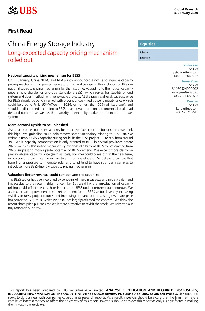 2026年1月30日,发改委与能源局联合发布通知,明确完善发电机组容量电价机制。这标志着独立储能首次被正式纳入国家级容量电价体系。