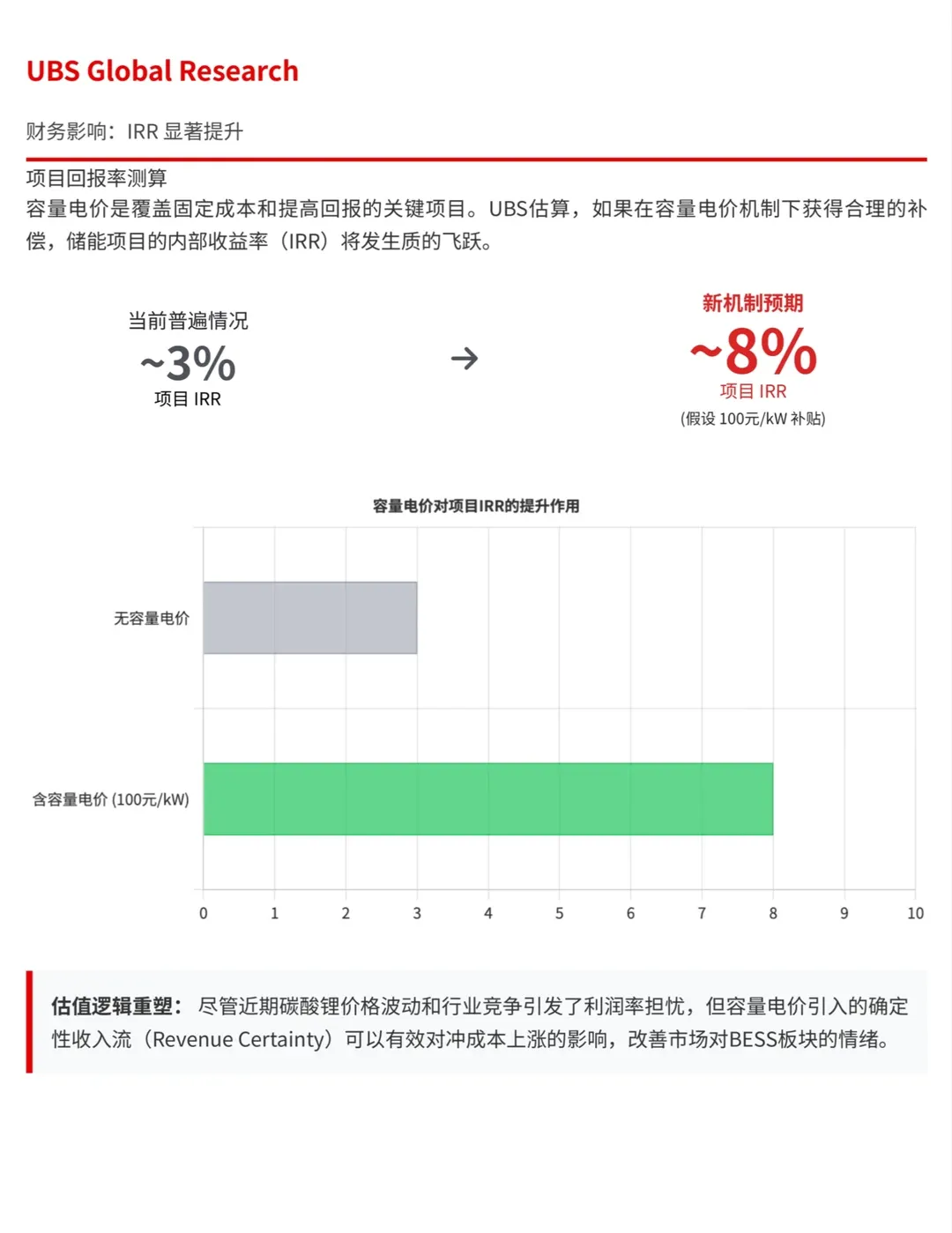 而新机制实施后,如果按照 100元/千瓦 的容量电价进行保守估算: 储能项目的IRR有望修复并提升至 8% 左右。