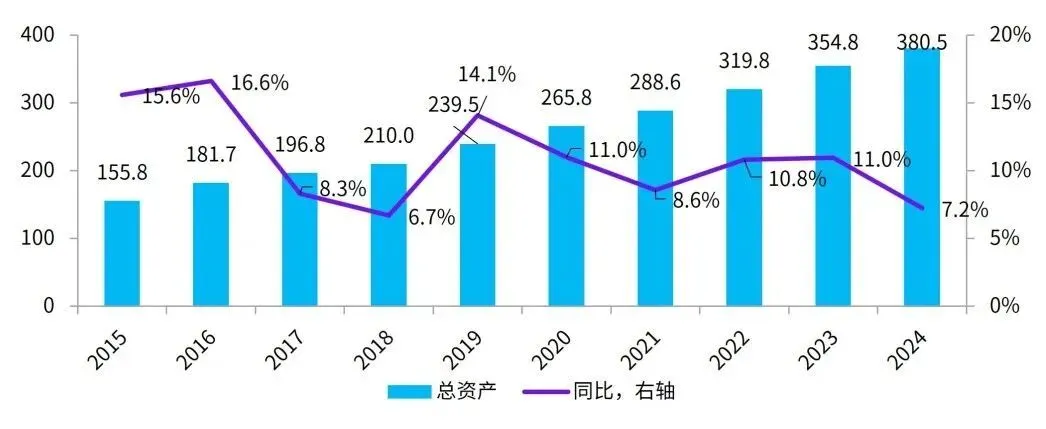 截至2024年末,商业银行资产总额达人民币380.5万亿元,同比增长7.2%,增速较上年回落3.8个百分点(见图1)。商业银行资产增速从过往两位数的高速增长逐步回落至个位数水平,这一变化反映了银行业在应对内外部环境变化过程中的战略调整,即从传统规模扩张模式转向更加注重质量与效率的精细化发展路径。