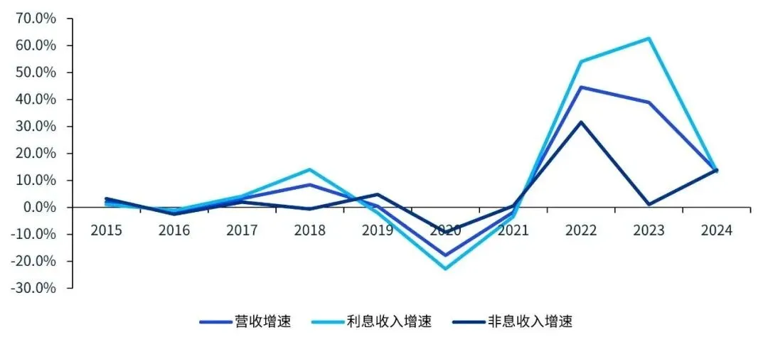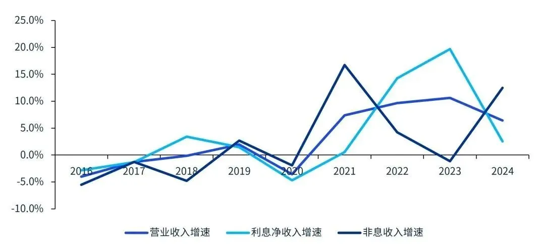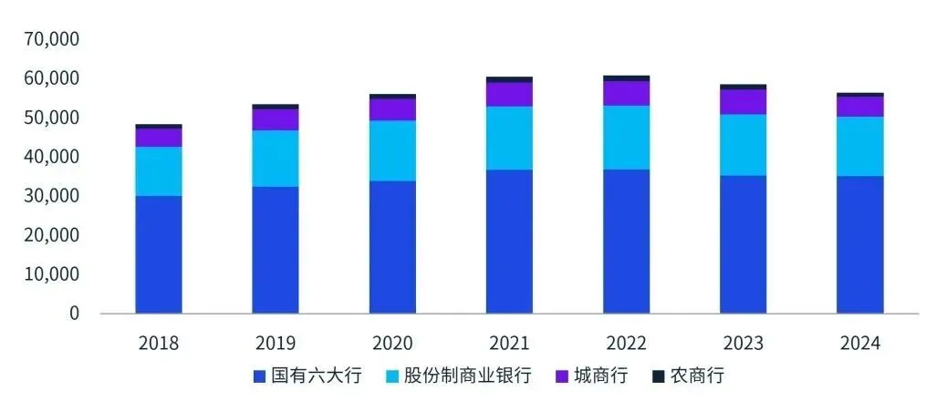 2024年,上市银行营业收入合计达5.65万亿元,较上年下降3.6%(见图3)。从不同类型银行来看,各类银行营业收入均出现不同程度下滑,其中农商行降幅最大,达24.5%;国有六大行降幅最小,仅为0.3%。