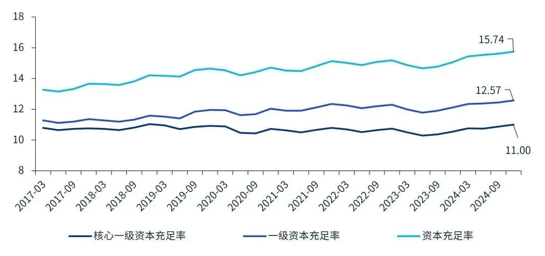《商业银行资本管理办法》(以下简称“《新办法》”)于2024年1月1日正式实施。与此前的商业银行风险权重计量方法相比,《新办法》对个人住房抵押贷款、企业债务工具及股权风险暴露等领域的风险权重进行了针对性调整,有助于进一步增强银行的风险抵御能力。2024年末,商业银行资本充足率为15.74%,核心一级资本充足率为11.00%,分别较上年提升0.68个百分点和0.46个百分点(见图4)。整体来看,各项资本充足率指标均呈增长态势,彰显银行资本实力的持续增强。
