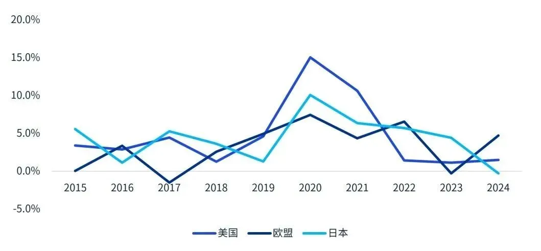 2024年,全球主要经济体商业银行面临相似的宏观环境挑战,包括经济增长放缓、信贷质量承压等,但同时也存在显著差异:主要发达经济体货币政策呈现分化态势,美欧等经济体多次实施降息操作,日本则采取逆势加息举措;各地区信贷需求因自身经济周期与货币政策路径的差异而表现出不同特征。