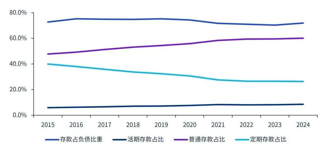 2024年,商业银行总负债规模为350.9万亿元,较2023年增加23.7万亿元,同比增长7.3%,增幅较上年下降3.9个百分点(见图2)。受资产收益下行影响,银行已启动主动压降存款利率的成本控制措施,预计2025年负债增长速度或将进一步放缓。