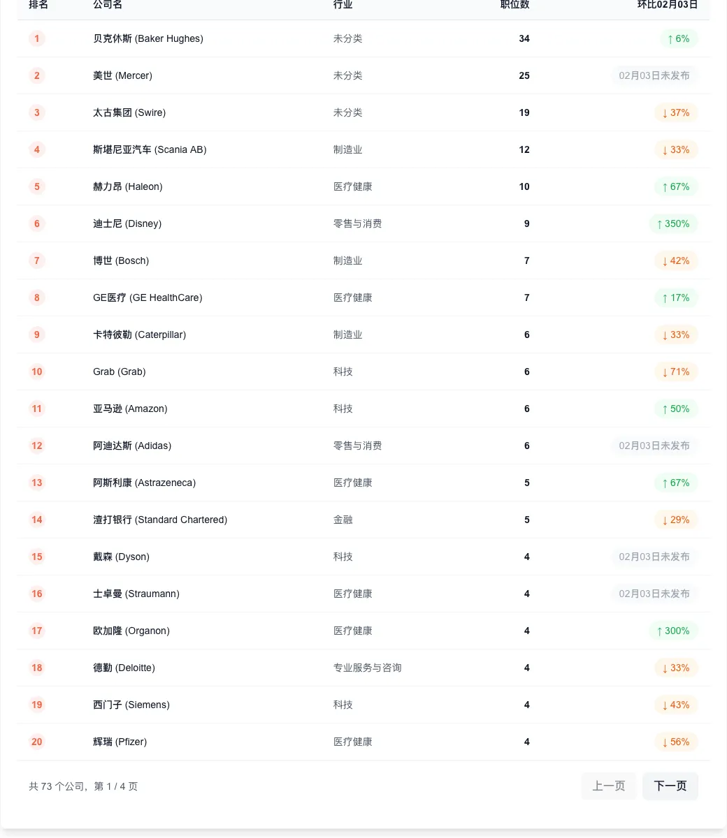 今日共有 73 家外企释放新机会。在公司活跃度榜单中,呈现出明显的行业分化特征: