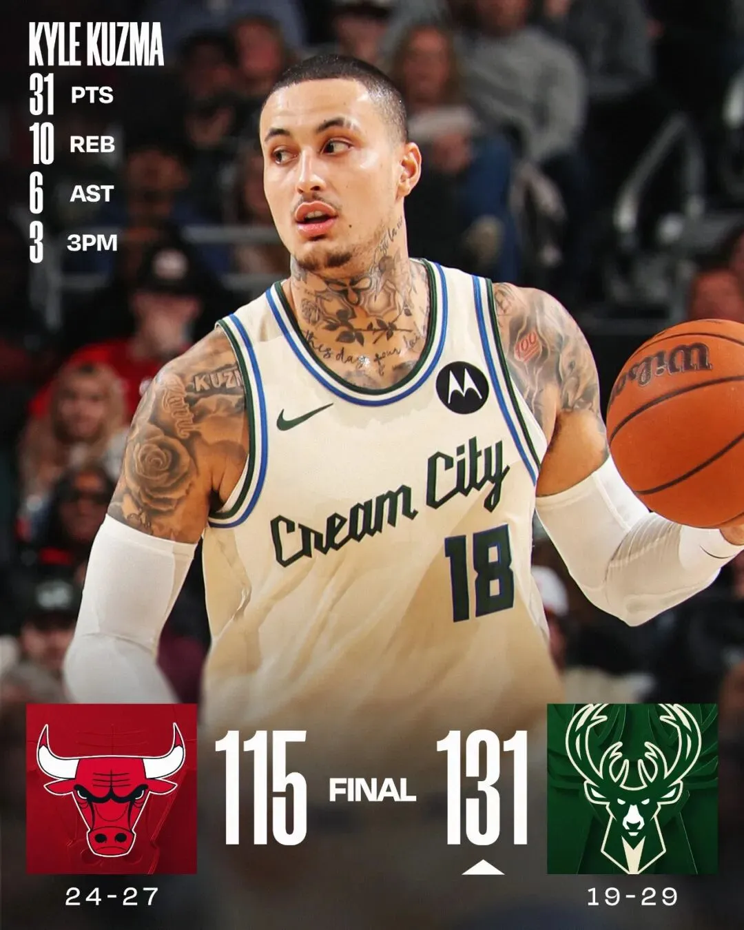 今日上午NBA常规赛,雄鹿主场以131比115战胜公牛,结束五连败的同时达成赛季三杀。雄鹿自字母哥伤缺后一蹶不振,本场比赛库兹马站了出来,砍下31分10篮板6助攻的数据,掀起了攻势。雄鹿上半场发挥强势,领先25分,下半场公牛有所反弹,但雄鹿始终占据上风,最终拿下了比赛。公牛将武切维奇交易至凯尔特人,因此他没有上场,公牛还需时间调整战术。研报临场看好的主赢顺利命中。
