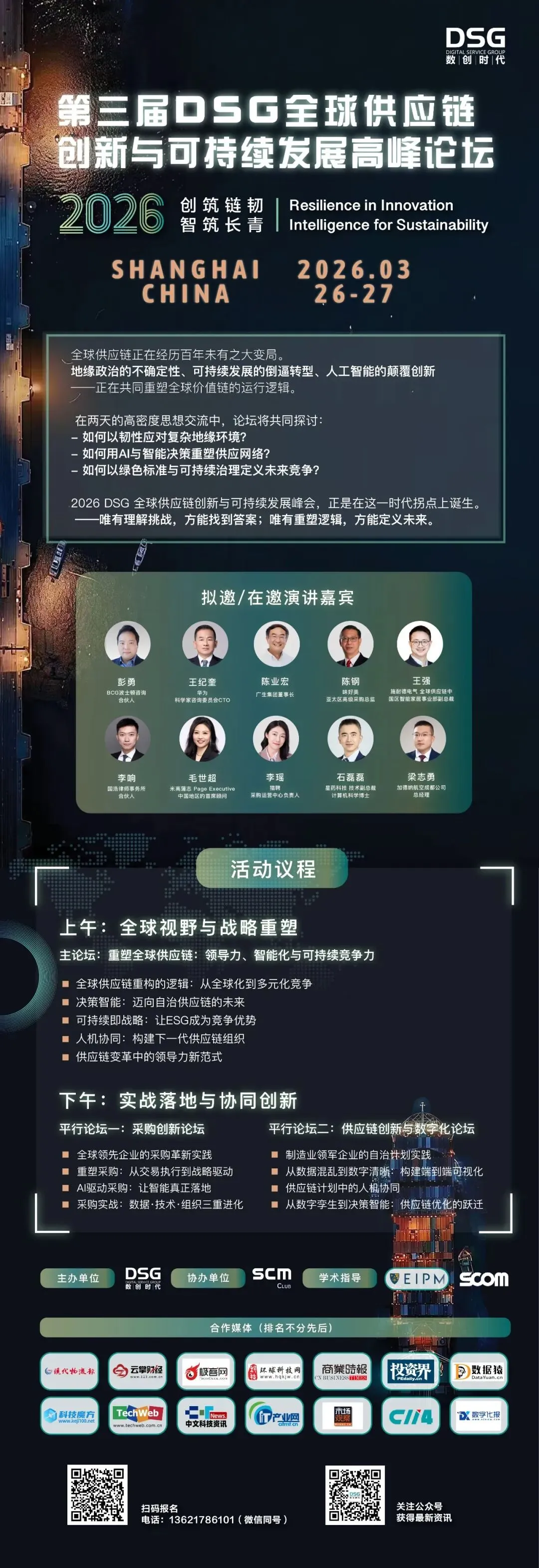 2026年3月26-27日,在上海,《创筑链韧·智筑长青-DSG第三届全球供应链创新与可持续发展高峰论坛》将汇聚供应链各领域的顶尖高管、专家,带来数智化解决方案和实战案例,期待与您共赴盛会,凝聚破局共识。