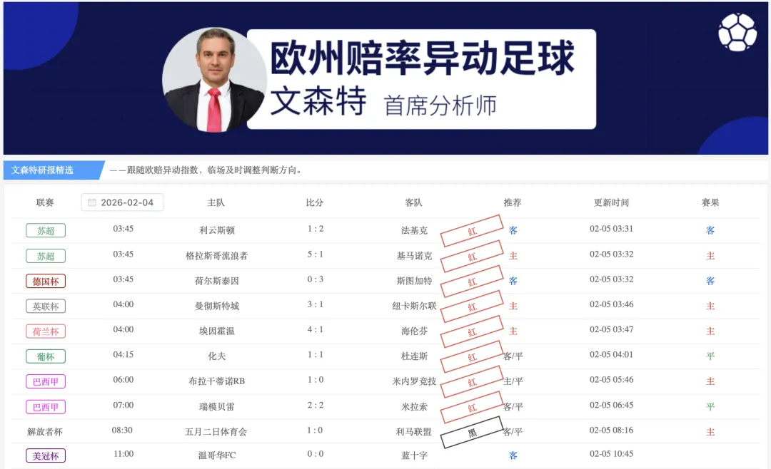 【欧指异动指数】(全赛事版)栏目的研报给出10场比赛,9红1黑,2月累计36红14黑,净胜+22,观察20家主力公司的临场指数变化,掌控比赛方向,2月稳定性达到72%。