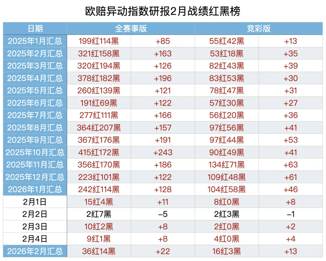 【欧指异动指数】(竞-彩版)栏目的研报给出4场比赛,4红0黑,2月累计16红3黑,净胜+13,观察20家主力公司的临场指数变化,掌控比赛方向,2月稳定性达到84.2%。