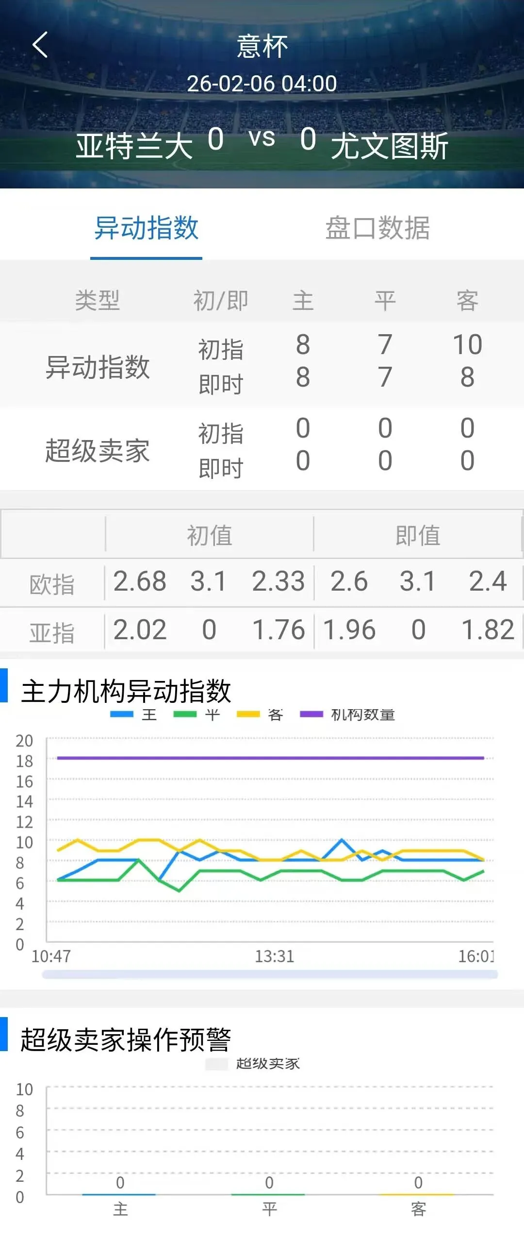 异动指数初指:8-7-10,发生平异动,数据博弈后,临场:8-7-8,主平不变而客降,但平异动始终维持,机构对分胜负缺乏足够倾向。