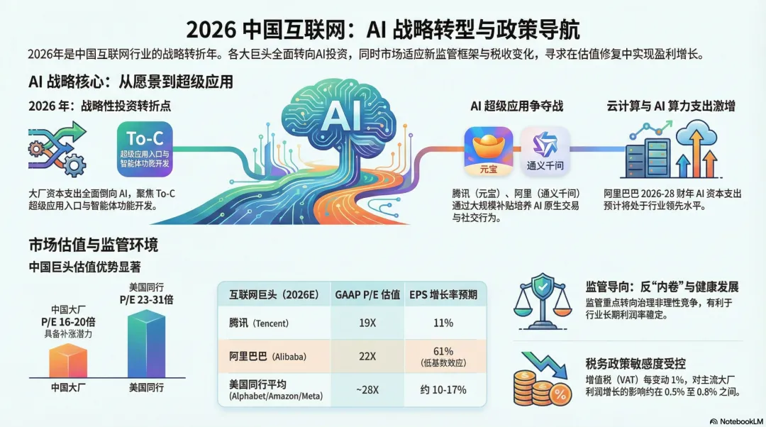 高盛研报-深度解析中国互联网AI三国杀,监管迷雾中暗藏黄金拐点2026年中国互联网行业正站在历史性拐点。高盛最新研报指出,三大巨头在消费级AI领域的军备竞赛已全面打响,而近期板块10%的回调与监管担忧叠加,反而创造了布局良机。当前中国互联网板块估值中位数仅17倍2026年预期市盈率,较美国同行折价超过30%,这可能是未来三年最重要的配置窗口。春节红包大战背后的AI超级入口争夺