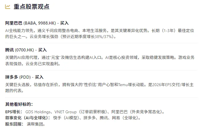 经过近期调整,板块估值已回归历史低位。腾讯16倍非GAAP市盈率,阿里巴巴20倍,拼多多仅9倍,较谷歌31倍、亚马逊31倍的估值折价明显。高盛建议关注三大投资主题:盈利兑现能力突出的标的(万国数据、世纪互联、阿里巴巴)AI与出海叙事转变的受益者(快手、拼多多、腾讯、网易)在子板块偏好上,云与数据中心、游戏与娱乐、AI模型位列前三。特别是AI模型作为新晋类别,受益于推理需求爆发式增长,可能成为全年最大黑马。