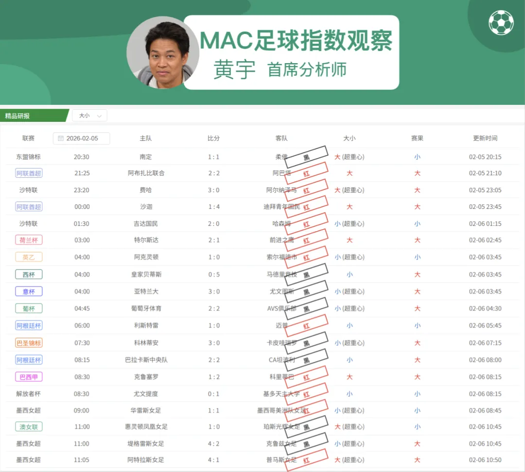 关注MAC足球指数观察研报,精心挑选每日赛事,随着指数变化时刻进行调整。研报已经为大家直接指明方向,简单明了,胜率值得信赖,只需选择心仪的比赛直接出手。