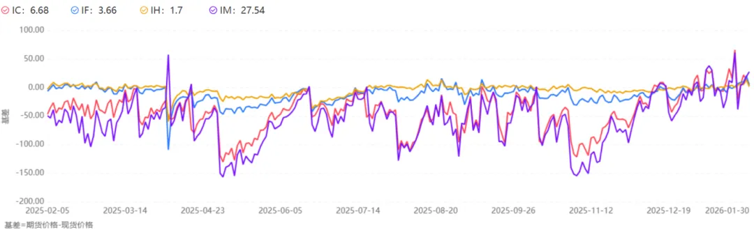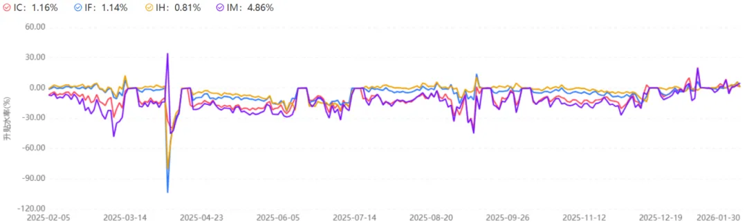 1月,股指期货基差整体呈现先震荡、后放大、再快速修复的运行特征,其中中小盘品种波动显著强于权重品种,结构分化明显。IC、IM月内多次在深度贴水与快速升水之间切换,下旬一度出现升水冲高后迅速转为深贴水的极端波动,反映短期情绪交易与资金博弈加剧;但月末基差重新回升并转为小幅升水,显示风险偏好边际修复、定价逐步回归理性。相比之下,IF、IH基差多数时间围绕零轴小幅波动,整体维持轻微贴水或近平水状态,体现权重指数定价更为稳定、防御属性更强,月末虽同步修复但弹性有限。综合来看,1月股指期货定价经历了由阶段性风险折价到中性修复的转变,与现货市场高位震荡、风险偏好温和回暖的环境基本一致,表明资金情绪在波动中边际改善,但趋势性做多信号仍有待进一步确认。