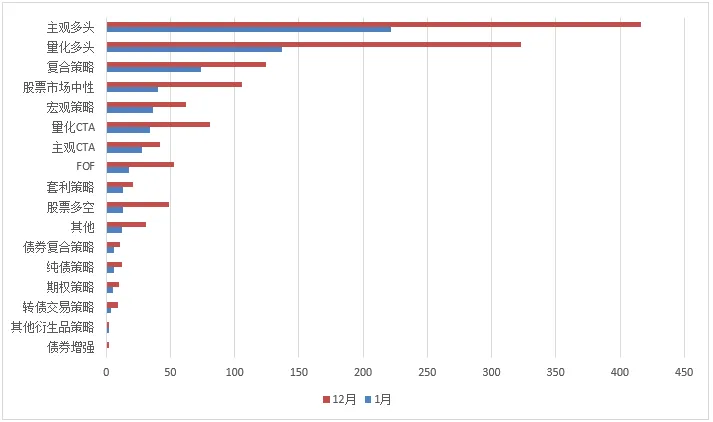 按照中基协数据,1月份共有650只产品经协会备案通过,相较去年12月份环比降低704只。按照对过往管理人策略、产品关键词以及与历史产品保持相同策略系列的统计方法,股票多头类策略产品备案数量仍多于其他策略,各策略备案节奏均明显放缓。截至1月31日,全市场百亿规模私募管理人数量由去年的112家上升至122家。