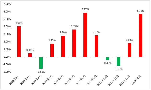 从资金层面看,1月市场整体维持较高成交活跃度,日均成交额持续处于高位。同时,国家队在月内对宽基指数型基金进行了明显减持,资金一方面向有色、半导体、电网设备等高景气细分主题结构性转移,另一方面,高成交环境也提升了交易型资金的市场参与度。在此背景下,以系统化方法驱动的投资策略相对优势逐步显现。相关策略依托规则化选股框架与多维度因子体系,能够在行业轮动加快、个股分化加剧的市场环境中更高效地捕捉结构性机会,并与主观多头策略形成互补,力争提升组合整体的弹性与稳定性。与此同时,指数增强类策略在一定程度上承接了“国家队减持宽基”之后的β配置需求。通过筛选历史表现稳定且具备持续性的超额收益来源,并适度提升有效因子暴露,此类策略力求在严控回撤的前提下增强组合收益弹性,成为当前震荡市环境中兼顾进攻与防御的重要配置工具。