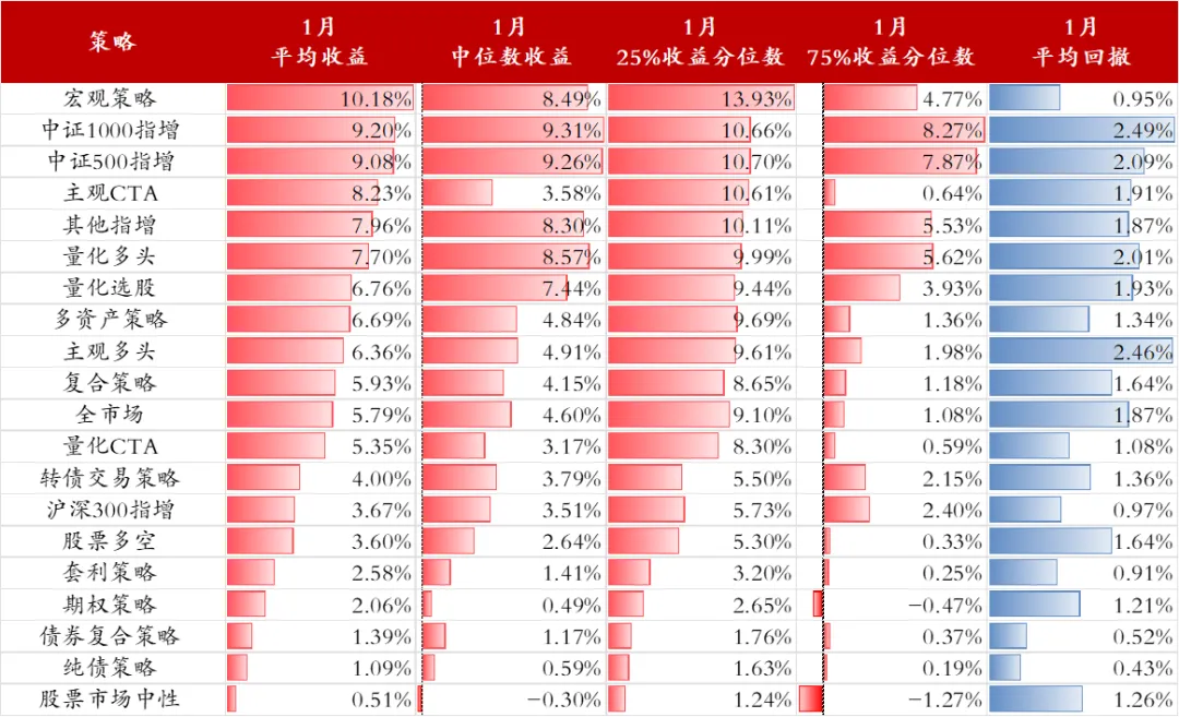 2026年1月属于典型的系统性回暖行情驱动的普涨月份,私募各策略整体胜率较高,多数策略平均收益达到7%–10%区间。