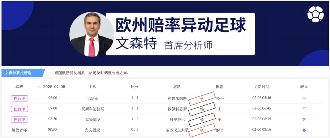 【欧指异动指数】(全赛事版)栏目的研报给出4场比赛,2红2黑,2月累计38红16黑,净胜+22,观察20家主力公司的临场指数变化,掌控比赛方向,2月稳定性达到70.3%。