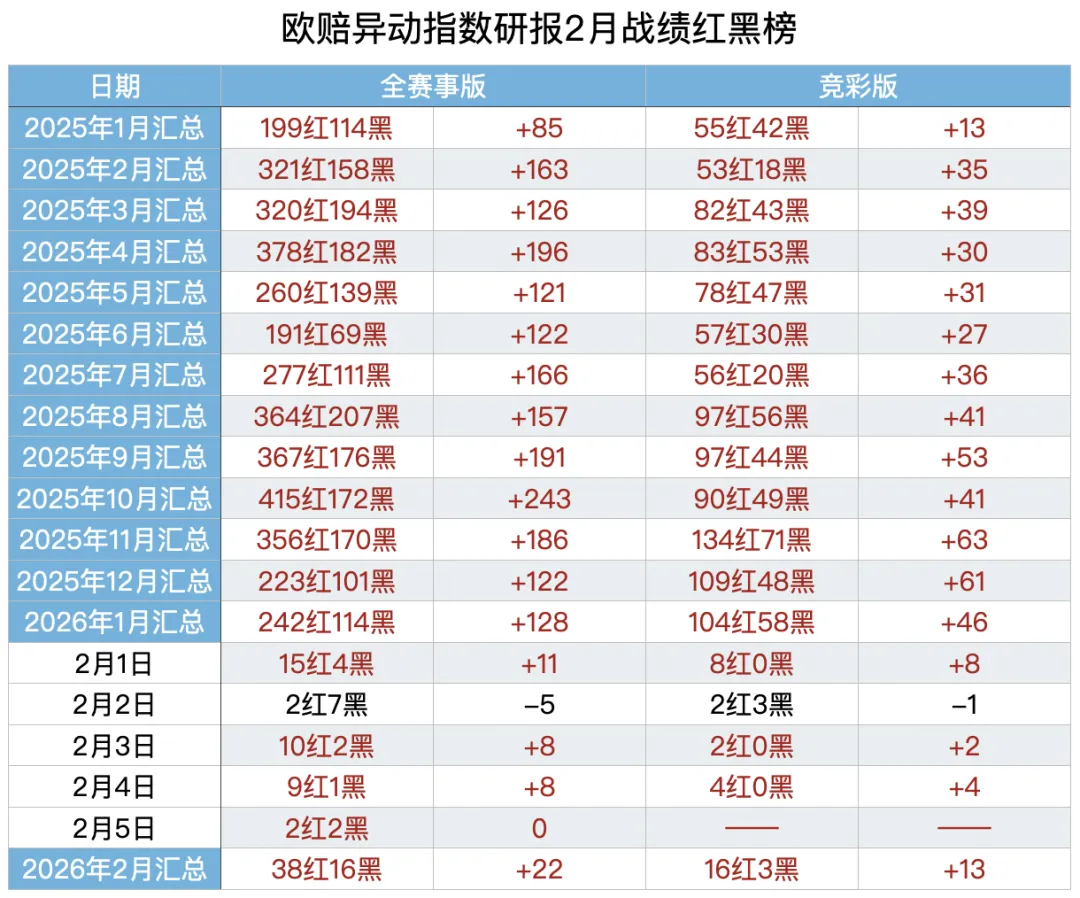 【欧指异动指数】(竞-彩版)栏目的研报给出0场比赛,0红0黑,2月累计16红3黑,净胜+13,观察20家主力公司的临场指数变化,掌控比赛方向,2月稳定性达到84.2%。