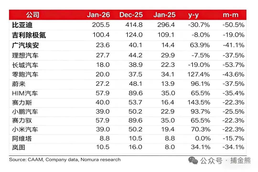 从核心数据表现来看,1 月车企销售环比数据集体为负,野村研报指出该月车企销售情况不是很理想。尽管背后有新能源购置税政策调整引发的需求提前释放因素,且春节后移带来的节前购车需求仍在发力,但所有车企均未能摆脱环比下滑的颓势,足见当前车市需求端的疲软程度远超市场预期。