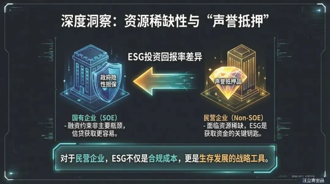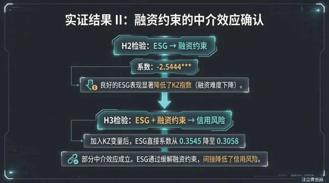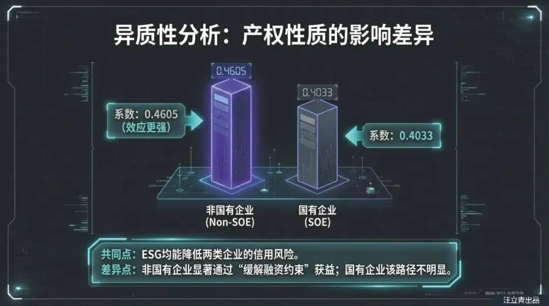 报告进一步挖掘了ESG影响信用风险的“中间桥梁”——融资约束的缓解。通过对2010至2021年间4237家上市公司的实证分析发现,良好的ESG表现是缓解融资难题的利器:一方面,充分的信息披露降低了投资者的风险预期,提高了信贷配给额度;另一方面,优异的社会声誉转化为品牌效应,增强了企业的竞争优势,,,,。值得注意的是,这种效应在非国有企业中表现得尤为显著,ESG通过缓解融资困境降低风险的路径在这一群体中具有极强的实战参考价值,,,。