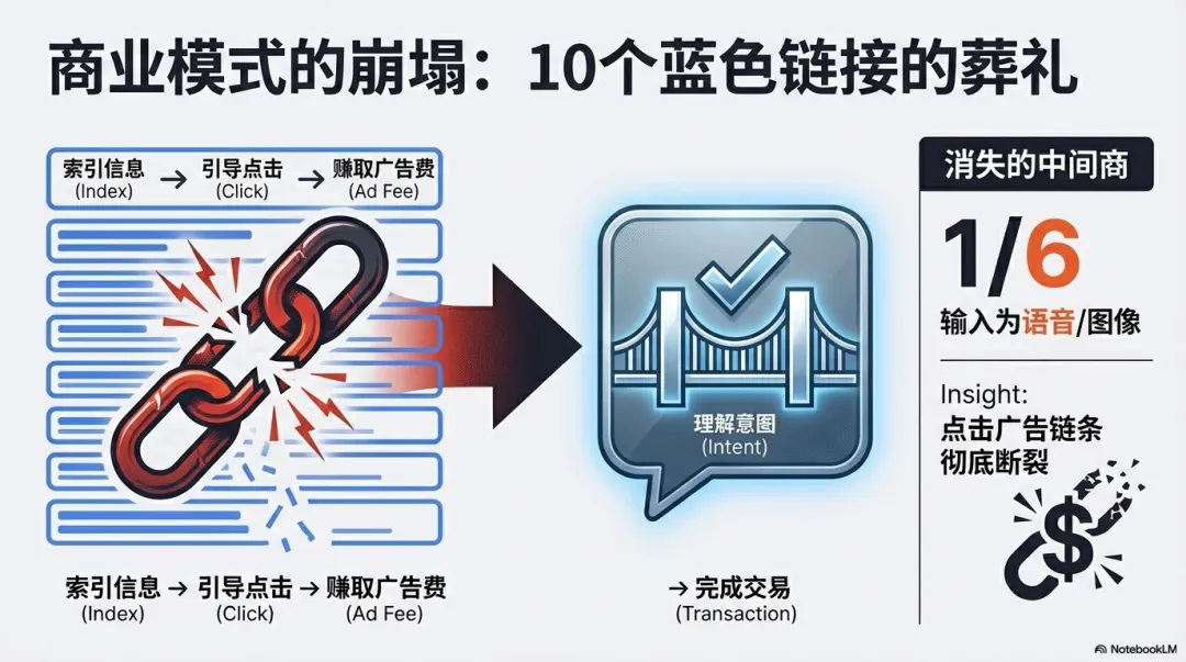 在目前的搜索结果中,已有1/6是语音或图像的非文本输入。更致命的是,用户不再需要跳到第三方网站。当Gemini能直接告诉你如何修好漏水的水管,并给出一份详尽的步骤时,那些曾经靠SEO生存的网站和Google赖以生存的点击广告链条,就彻底断裂了。