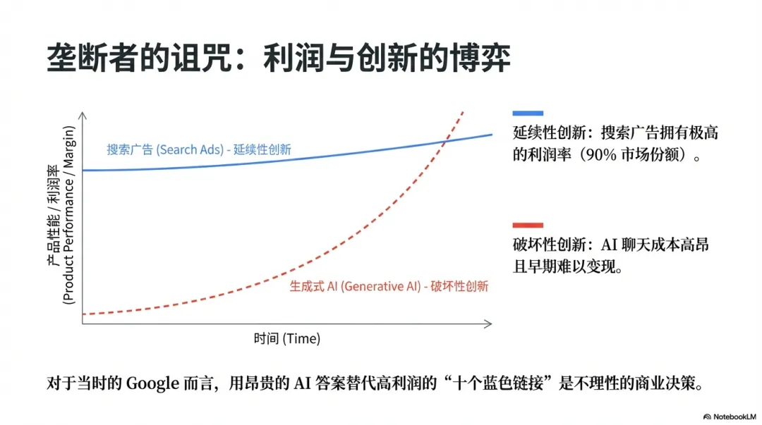 左手是每用户年均400美元的搜索广告现金流,右手是成本激增、可能毁灭原有模式的AI浪潮。如果按照克里斯坦森的理论,大公司往往死于对现有价值网络的过度忠诚。